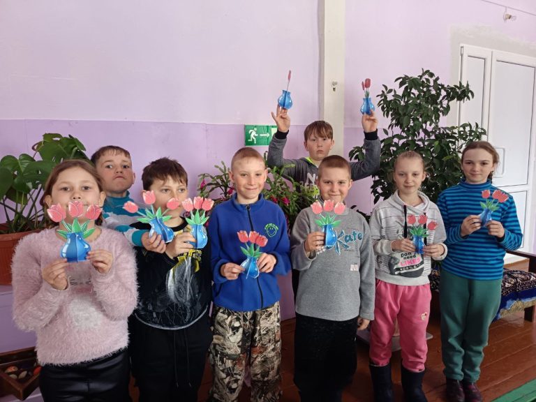 «В день 8 марта» название нашего мастер класса. И такие букетики ребята сделали мамам к празднику.
